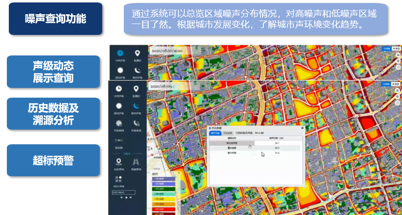 应用场景主要用于对城市环境噪声常规监测数据、声环境区划数据、噪声在线监测数据及噪声地图数据进行存储、处理、管理、挖掘、分析、可视化的信息管理平台。